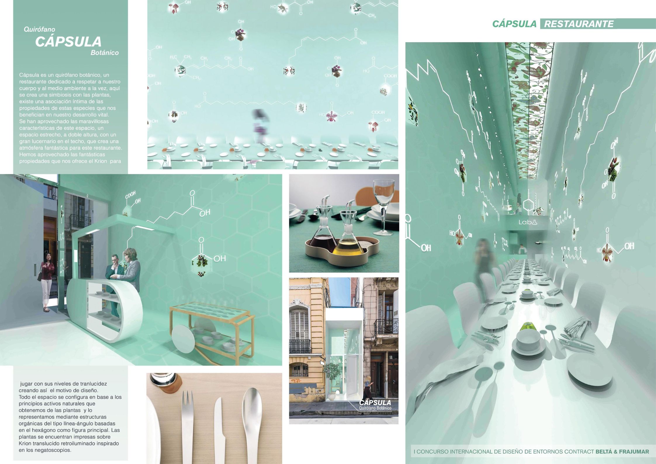 Primer Premio Categoría Estudiante por conseguir que la distribución de un espacio limitado se convierta en un punto a favor, dotando de personalidad al proyecto. Por integrar espacio y servicio ofrecido, por su original y arriesgada tematización es para Alejandro Sánchez por el proyecto Cápsula Restaurante. Hizo entrega del premio D. Marcos Ortuño Soto Alcalde de Yecla.