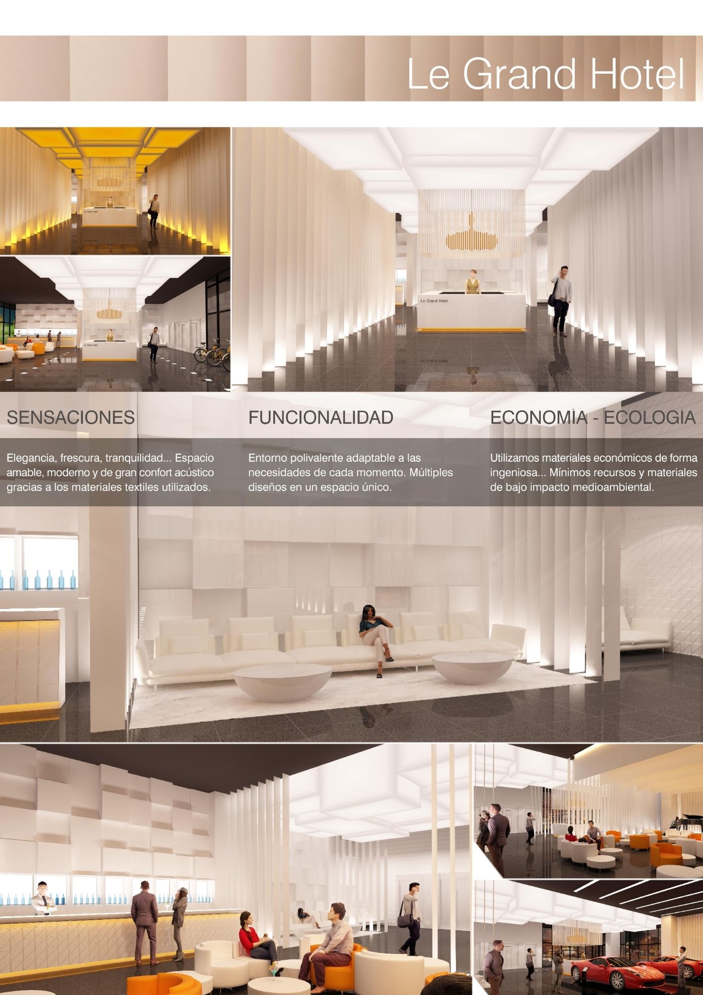 Tercer accesit por crear un espacio estimulante y funcional. Donde destaca la polivalencia del espacio desarrollado, el confort acústico, el interés por las sensaciones que percibe el cliente es para Dsignio por el proyecto Le Grand Hotel. (Dsignio no está presente, recoge el premio en su nombre Carlos Juan). Hizo entrega del accesit la decana del Colegio de Diseñadores de Interior y Decoradores de Murcia. Rosa Sánchez.