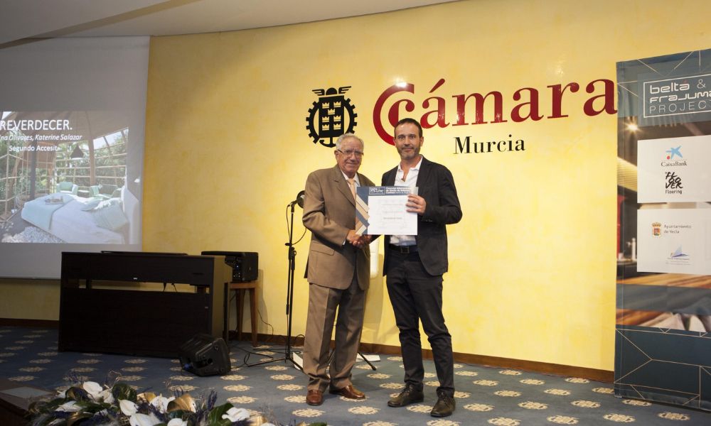Segundo accesit por generar una propuesta integrada con su emplazamiento, respetando el entorno, su flora y su fauna, haciendo uso de materiales de la zona para minimizar el impacto ambiental del proyecto. Creando un santuario natural con arraigo es para Cristina Olivar y Katerine Salazar por el proyecto Reverdecer. (Por ser de Chile no están presentes, recoge el premio en su nombre Jorge Juan) Hizo entrega del accesit Pedro Garcia Balibrea Presidente de la Cámara de Comercio de Murcia.